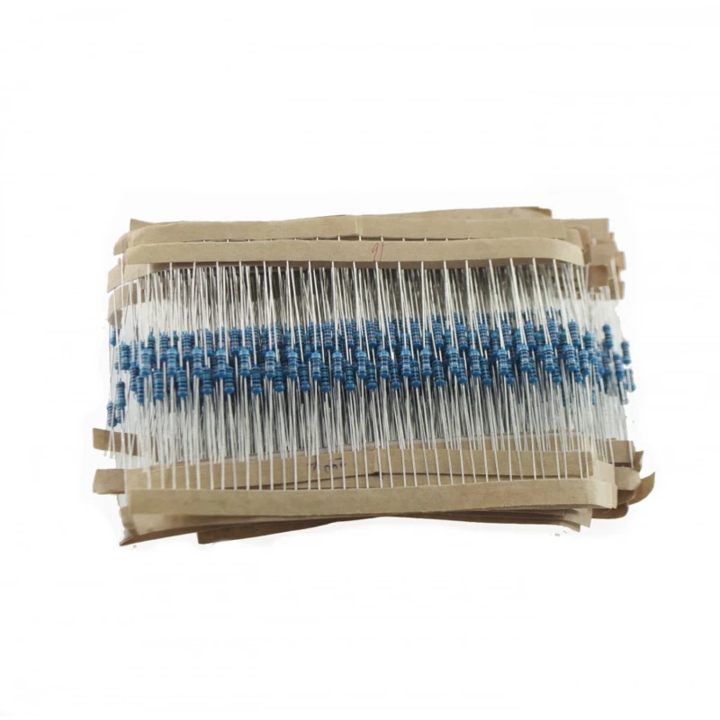 Chaque résistance mesure environ 6 mm de long pour 2 mm de diamètre (type axial standard 1/4W) et pèse environ 0,1 g. Le pack de 820 unités pèse au total environ 82 g. En général, les résistances sont étiquetées et regroupées par valeur, ce qui facilite leur identification et leur sélection dans le lot.