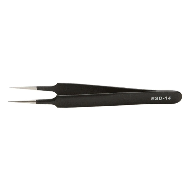 Les pinces antistatiques ESD-14 mesurent généralement 140 mm de long, avec une pointe fine d’environ 0,4 mm, et pèsent près de 20 g. Ces dimensions conviennent à une manipulation précise en électronique.