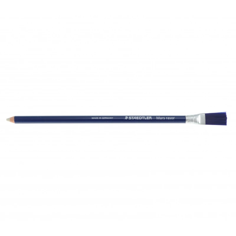 Le Staedler Mars Rasor mesure généralement environ 175 mm de long pour un diamètre de 7 à 8 mm. Son poids est d’environ 10 à 15 g. Le corps est en plastique et contient une gomme abrasive formulée à base de microgranules de silice, avec une brosse à poils synthétiques intégrée à une extrémité.
