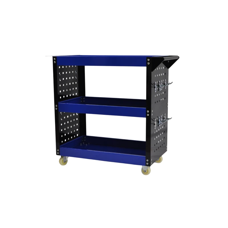 Chariot d’atelier professionnel 3 étagères avec plateaux latéraux et crochets pour organiser votre atelier